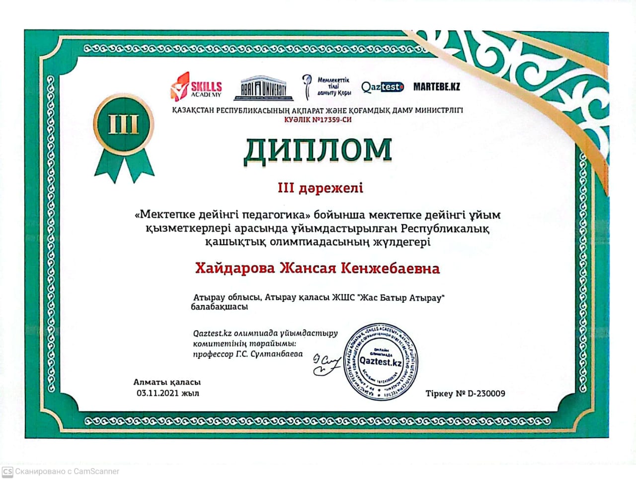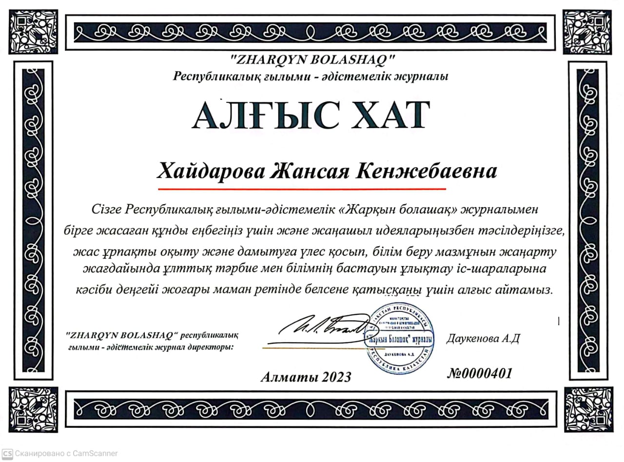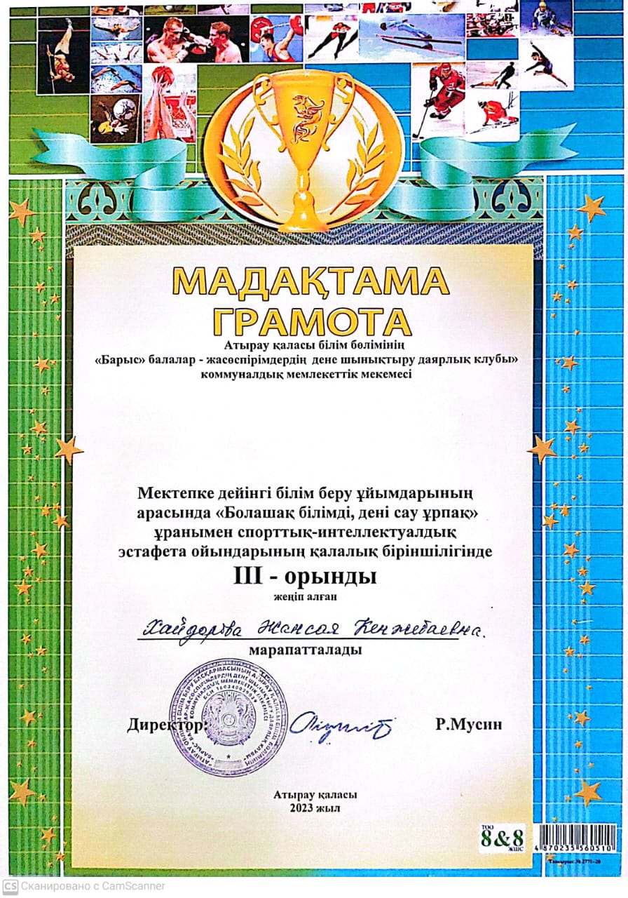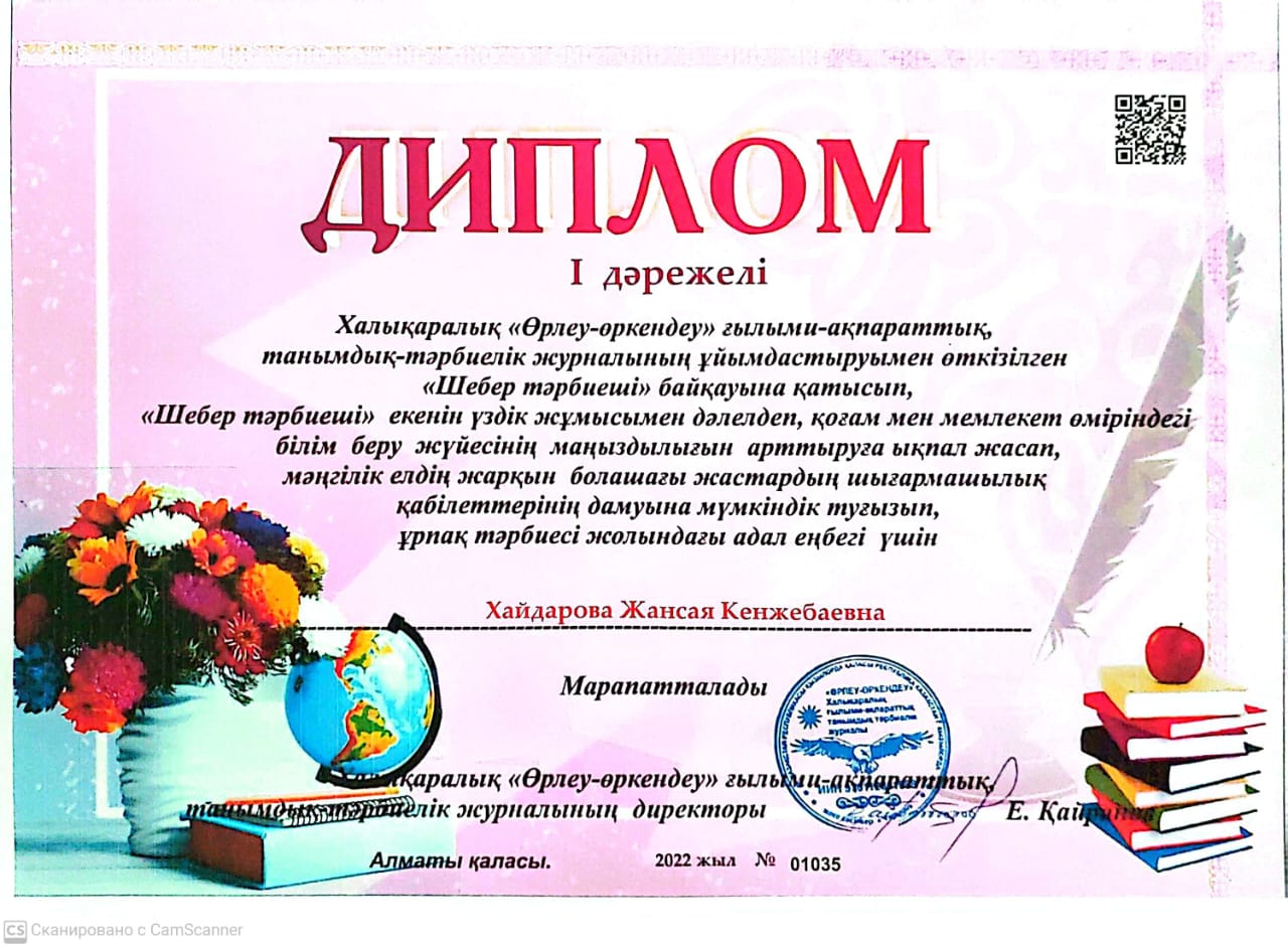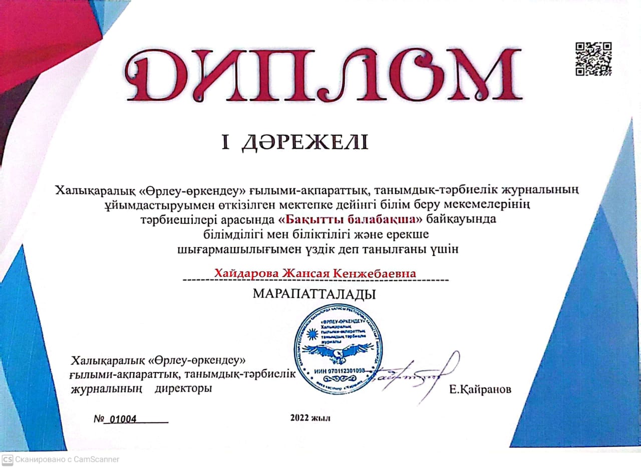 2021 - 2022, 2022 - 2023, 2023 - 2024 оқу жылындағы тәрбиеші жетістіктері. Тәрбиеші: Ж.К.Хайдарова №1
